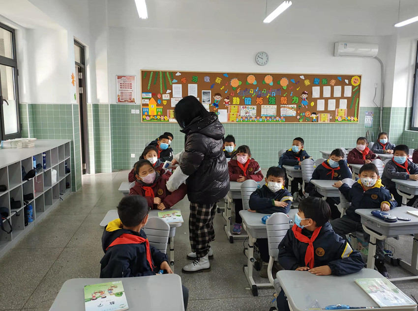 早晨,学校保安、值班行政、护导教师、家长志愿者等人员及时到岗,维护入校秩序并进行入校晨检。学生佩戴口罩,间隔1米,依次排队测量体温,体温正常者才有序进入校园。在检测过程中,护学岗“突发”一名学生体温异常,第一时间把学生带至校门旁临时隔离点,向学校保健室报告,并同时联系家长。家长到校达后,保健室顾老师主动询问家长及同住人员14天内有无疫情中高风险区旅居史,是否有与确诊病例、疑似病例接触史,做好详细记录。随后让家长将该名学生带至就近定点医院进一步检查和治疗,顾老师嘱咐家长两点:一是去定点医院就诊时尽量不要乘坐公共交通工具,全程佩戴口罩;二是就医过程中及时向学校汇报学生体温和就诊情况。