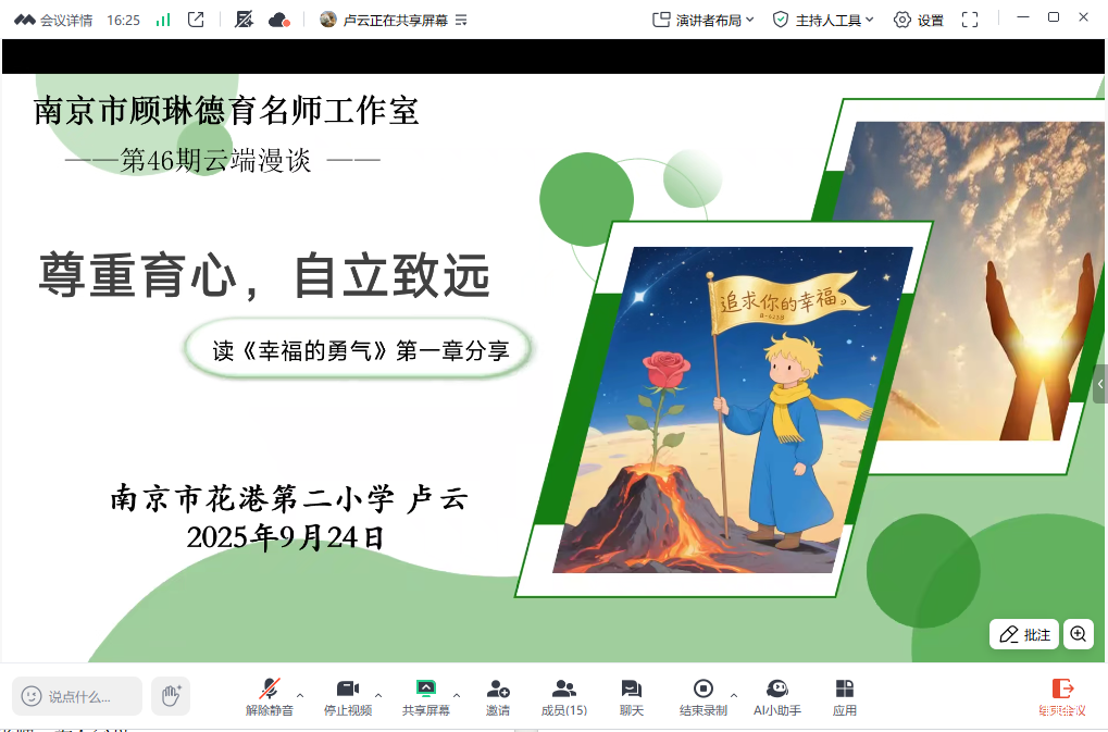 924日晚,南京市顾琳德育名师工作室第六十“云端漫谈”读书分享活动在线上顺利举行。本次活动共读日本学者岸见一郎与古贺史健合著的《幸福的勇气》第一章,以“以尊重育心,以自立致远”为主题,由花港第二小学卢云老师主持,工作室全体成员围绕教育中的“尊重”“自立”与“课题分离”等核心概念展开深度交流与育人实践分享。