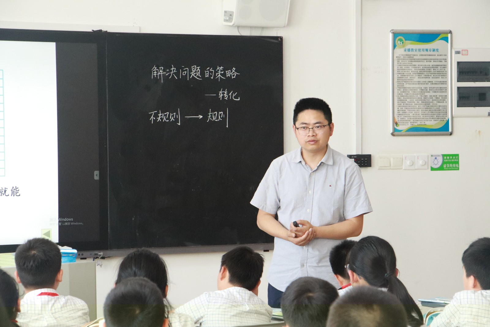 课例展示环节:第一节课由“王海燕工作室”成员王守文老师执教五下《解决问题的策略(1)》。王老师以学生为主体,让学生独立探究,经历转化的完整过程,通过数一数、拼一拼、移一移等活动,建立不规则图形与规则图形之间转化的全过程表象。在反思与追问中感受转化策略的“变”与“不变”,在交流与比较中感知转化的价值。