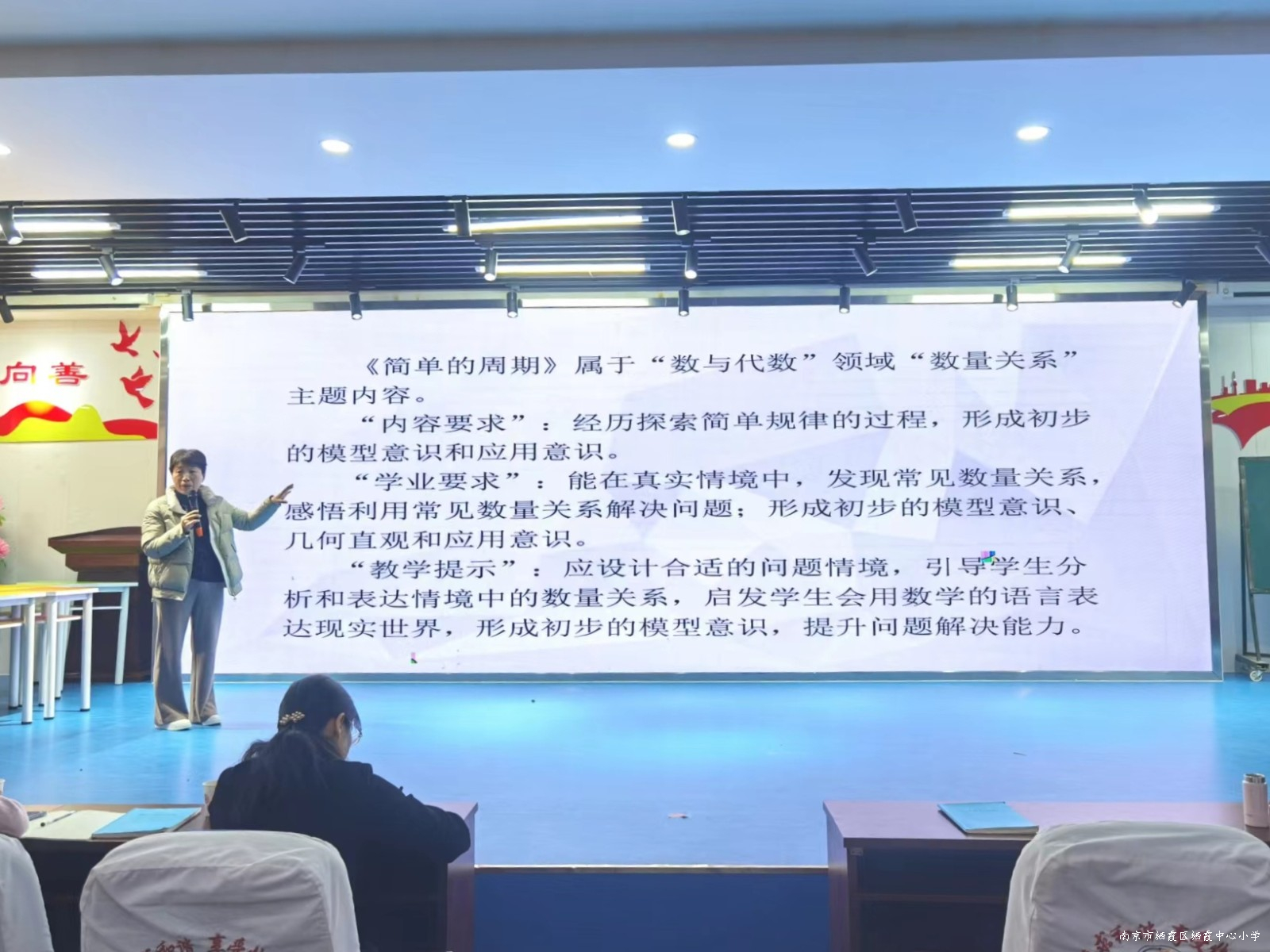 接着由栖小党总支书记王海燕结合课例《简单的周期》,进行了题为“核心素养培育落实在每一节课之中”的主题讲座。她详细介绍了怎样科学合理制定单元学习目标及课时学习目标。系统阐述了目标制定的基本原则,以及围绕目标设计体现素养形成与发展的教学路径。