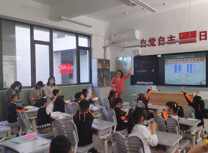 首先,由我校一年级何荣萍老师执教一节示范课《10的认识》。一年级学生活泼好动,以具体形象思维为主,何老师从猜数引入,激发学生的兴趣。创设庆祝国庆节的生活情境,鼓励学生用不同的方式数一数,再引导学生从身边找一找哪里藏着10,从10个小朋友、10朵花、10个数珠,10根小棒……从大量的具体事物中抽象出“10”,从具体走向抽象,充分感知,循序渐进提升学生数学思维。整节课上,学生猜一猜、数一数、摆一摆、玩一玩,动静结合,整节课堂学习氛围浓厚。