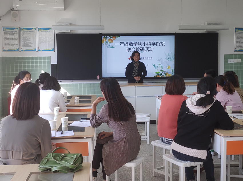 为了推进幼儿园与小学科学有效衔接,保证幼儿顺利实现从幼儿园到小学的过渡,10月12日下午,华侨城小学开展了一年级数学幼小科学衔接的联合教研活动。参加本次活动的有栖霞中心小学肖燕副校长,华侨城小学宋红斌校长、夏翠霞副校长,栖霞中心小学一年级数学组教师、幼儿园教师代表及华侨城小学低年级数学组全体教师。