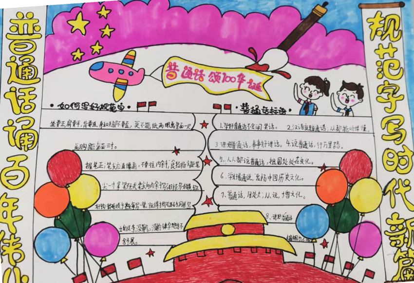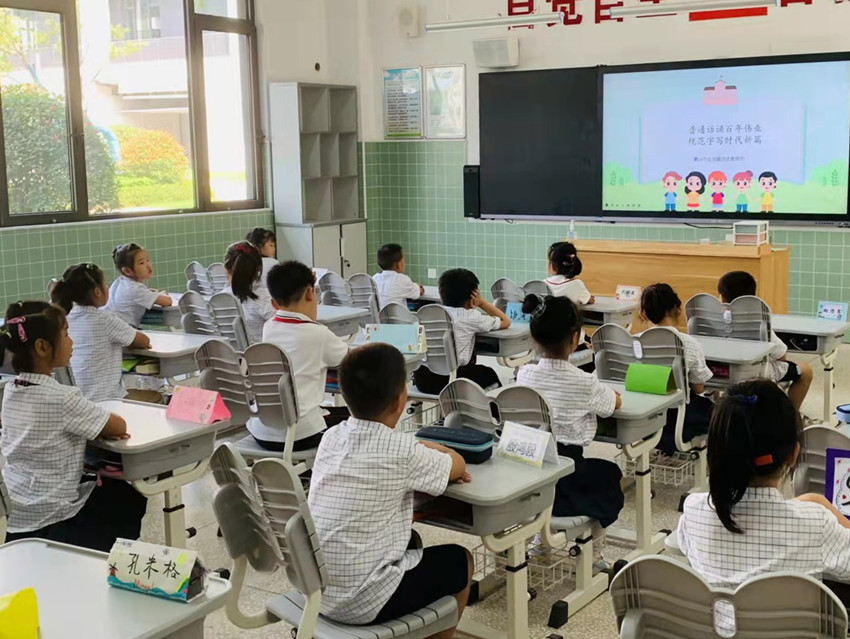各班级开展了“普通话诵百年伟业,规范字写时代新篇”主题午会,让“普通话诵百年伟业,规范字写时代新篇”的主题进校园、进课堂,规范使用祖国语言文字和传承中华优秀文化意识深入广大师生心灵。一二年级利用晨读时间进行普通话训练;三四年级学生动手制作小报;五六年级同学用字正腔圆的朗读表达对普通话的热爱。华侨城小学的青年教师们拿起粉笔,共写一首古诗,书写经典。