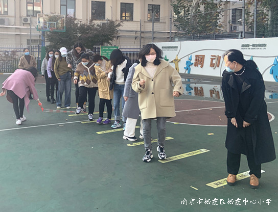 11月25日,炼油厂小学工会组织教职工在操场开展了一项有趣的活动——“一跳到底”。大家按年级组分成六队,每队队员保持距离站成一条直线,两位队员手持绳子从队员们脚下穿过,队员们快速跳过绳子。活动过程中,老师们感到筋骨舒活,精神抖擞,心情放松。