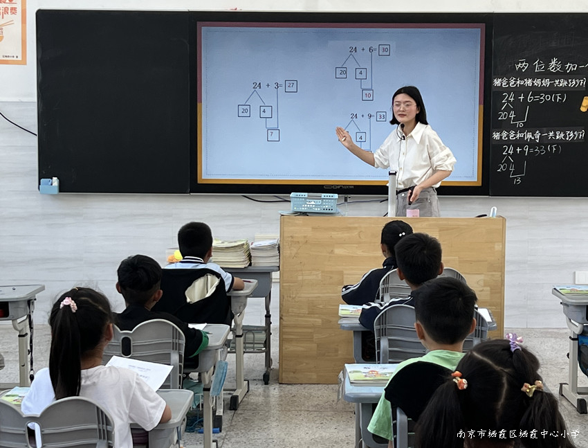 根据之前教研组老师们的建议,王老师更加注重算理的教学,充分发挥两位数加一位数(不进位)口算的迁移作用,让学生体会相同数位相加,也就是几个一和几个一相加、几个十和几个十相加。在探究环节,王老师让学生充分摆小棒,说计算过程,感受都是先算单根相加,相加满10根或者超过10根,就转化成一捆,体会10个一就是1个十。最后通过对比感悟进位加的算理。
