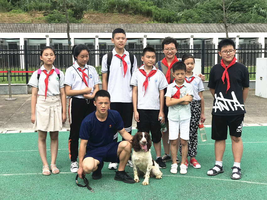 紧接着,队员们来到了搜救犬训练基地,三十多只搜救犬闻声而呼,似乎是在欢迎学生们的到来。“走、卧、停……”随着训练员简单的口令,一只名叫“菠菜”的搜救犬出场,它相貌小巧可爱,本领却令人刮目相看。尽管室外烈日炎炎,但是“菠菜”地毯式搜索让大家刮目相看,佩服不已。训练员一声命令“搜”,“菠菜”全程没抬头,趴在地面不放过任何一个地方,灵敏的鼻子一直贴着地面,几十秒的功夫准确无误地锁定目标位置,孩子们高呼“厉害!”这次参观,孩子们近距离与搜救犬们来了次亲密接触,感受到了它的高超本领。