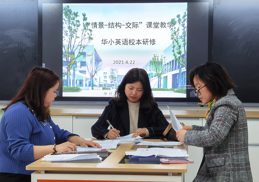 第二环节是课后研讨。首先是苏老师对于这节课的说课。紧接,着由组内老师对这节课进行了点评和提出建议,如对于难点要进行操练、最后的输出环节要把话语权交给学生等。然后,苏老师分享了自己两次磨课历程以及每一次的课后反思,同时对自己本节课中的不足进行了反思。经过本次活动,华小英语组的老师们对“情景——结构——交际”的校本主题有了更深入的理解。