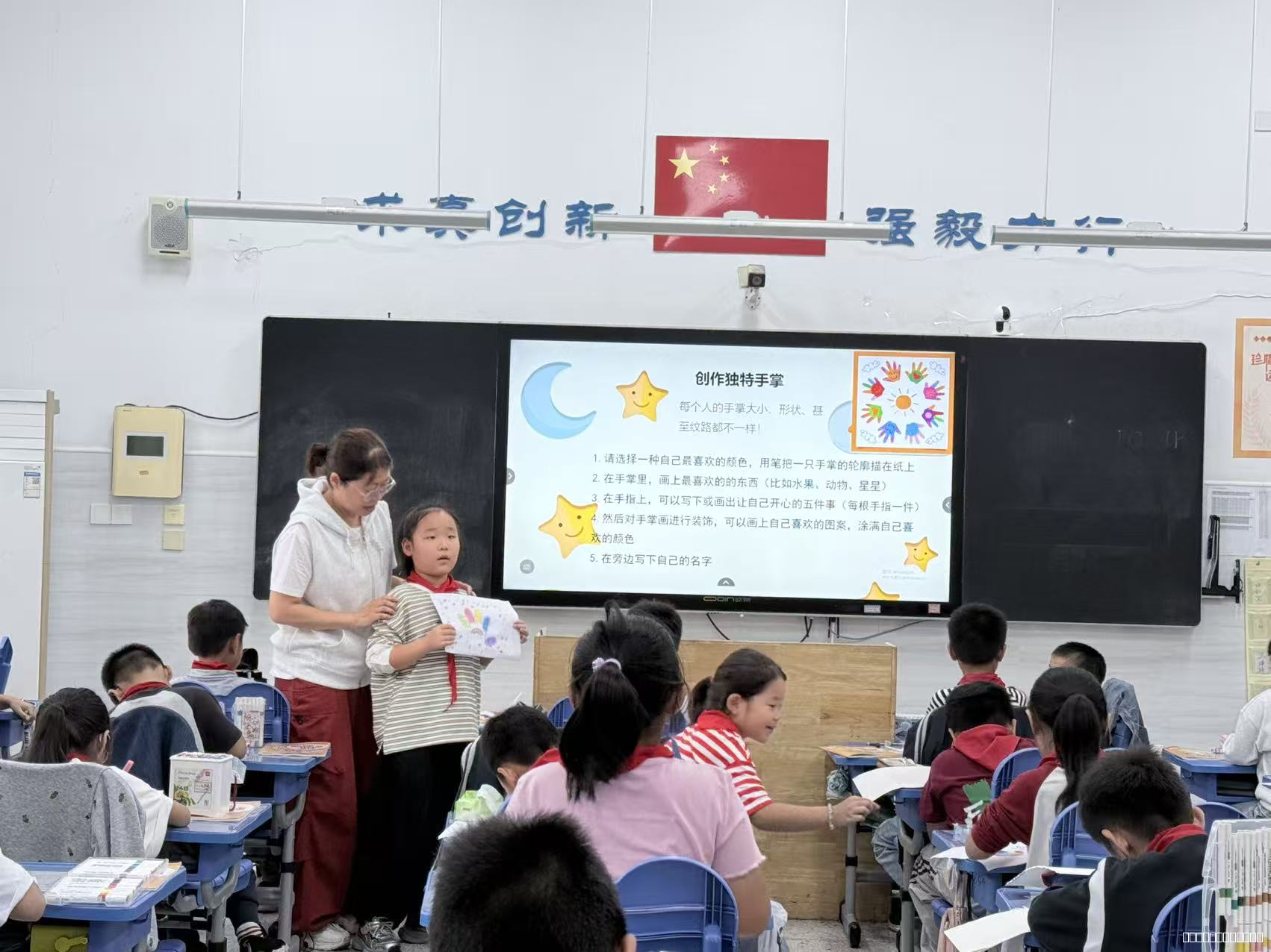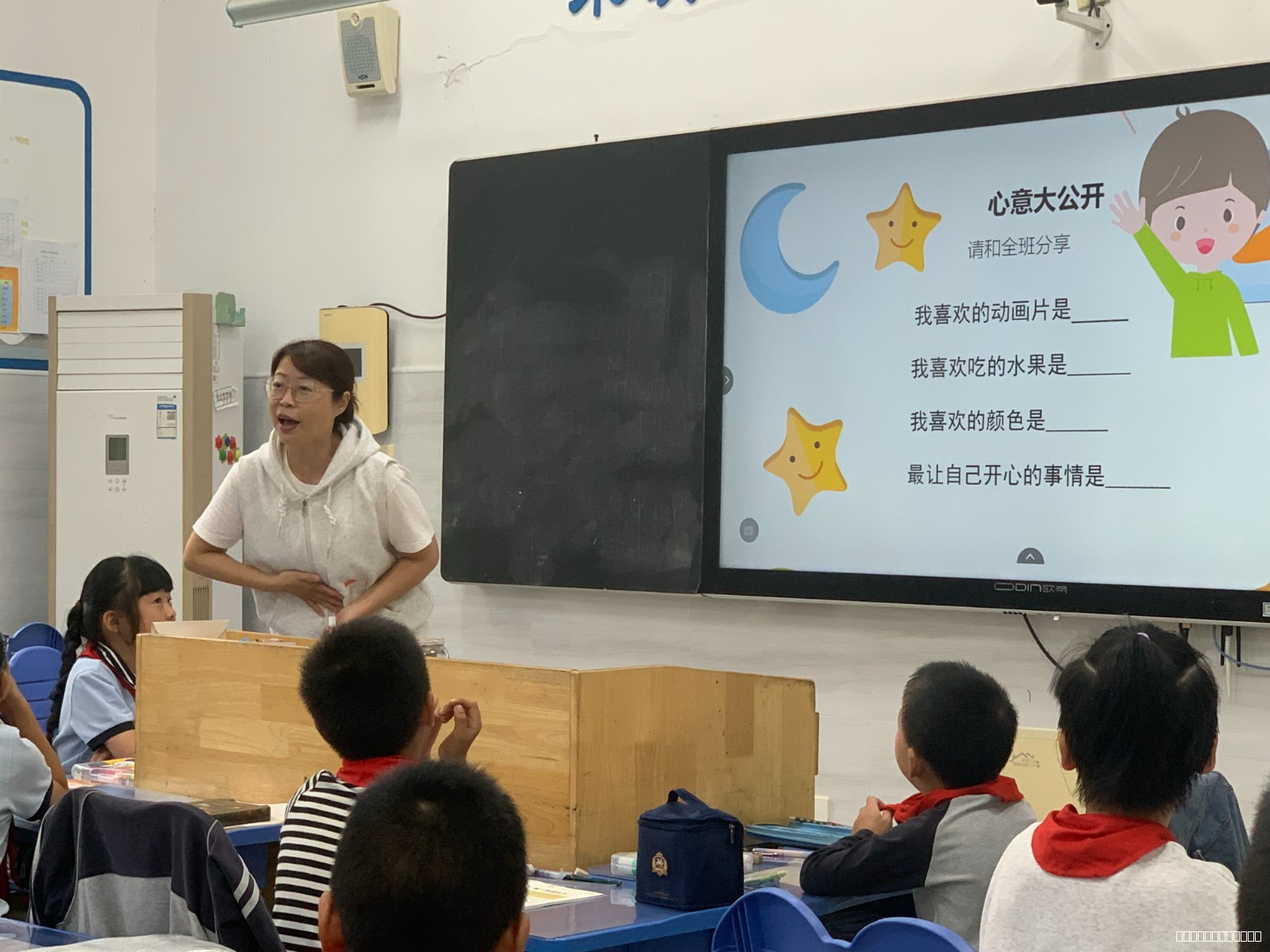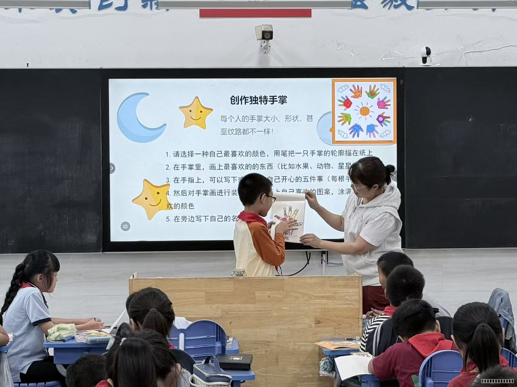 公开课结束后,谢老师简单对自己这节课进行了说课。三年级小朋友语言还不那么丰富,自律能力也不够强大,因此,从猜动物进入能一下子抓住学生的注意力,将他们快速带进课堂。做镜子动作,分享你的最爱这两个活动也很简单,让每个学生都敢于参与并积极表达。最后的手掌画既能让学生直观地感受到每个人的独一无二,也用绘画弥补了三年级学生表达能力的不足。