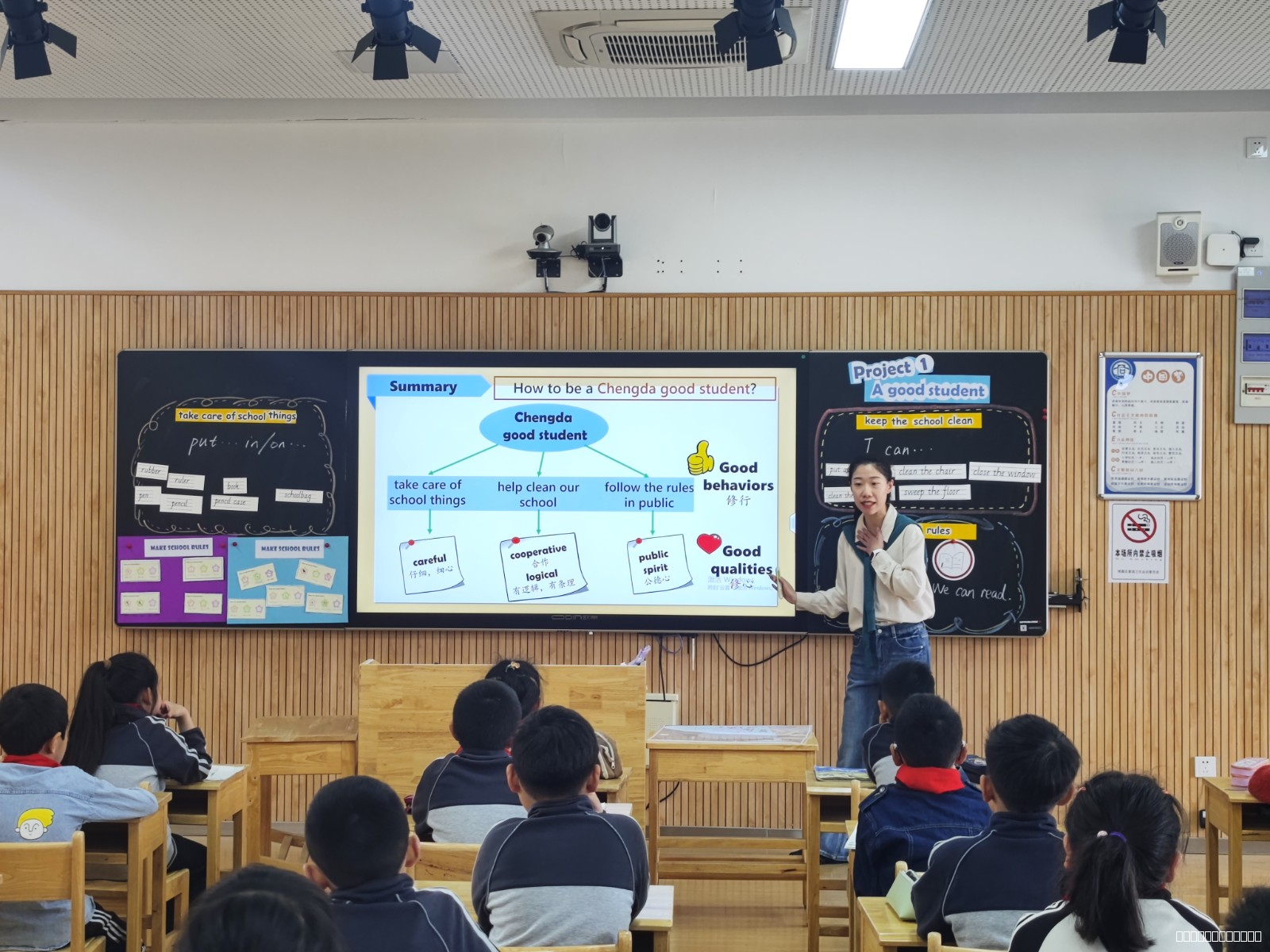 活动以两节跨学科示范课拉开序幕。英语教师王粤玥执教的三年级综合实验项目Project1 A good student以“诚达好少年”为主线,通过设计校园规则标识、小组合作展示等任务,引导学生用英语探讨责任意识与集体精神。学生在语言实践中反思个人成长,内化“爱护环境、遵守规则”等价值观。