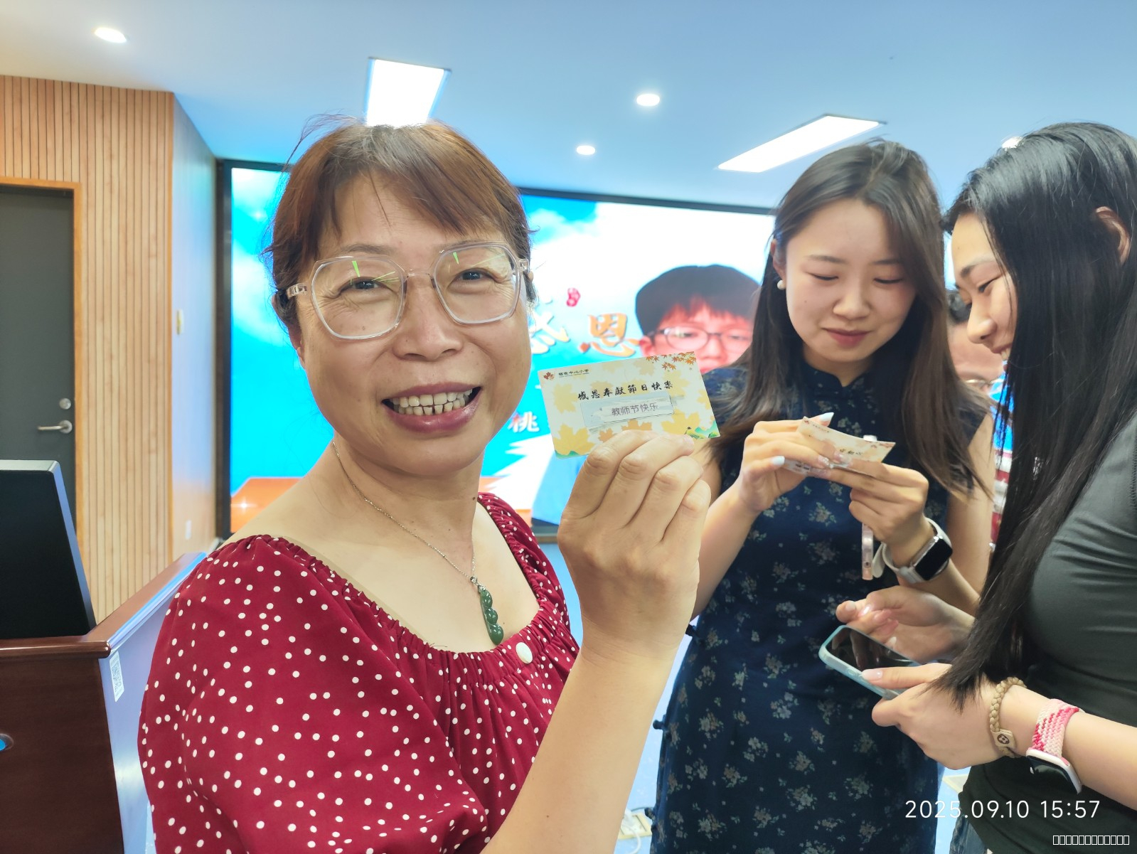 节日未至,温情先达。自9月初起,校园内便弥漫着感恩的气息。学生们自发组织的“感恩教师系列行动”更是将尊师之情化作具体行动:一张张亲手绘制、写满真挚祝福的贺卡和感谢信,被悄悄放在老师的办公桌上;一段段由各班录制的感恩祝福视频,在校园电子屏上循环播放,镜头里学生们纯真的笑脸和诚挚的感谢令人动容,表达对老师的敬意。整个校园沉浸在一片温馨、和谐的节日气氛中。
