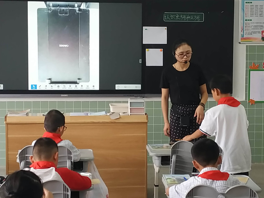 本次竞赛的课题是三年级上册《认识长方形和正方形》。课前,肖老师进行了独立备课,她精心设计了课堂的每一个环节。课上,老师带领学生进行了两次“玩转图形”的探究活动,通过量一量、折一折、比一比等方式找到了长方形、正方形的边、角的特征。课堂中,学生积极参与、主动分享,课堂效果较好。