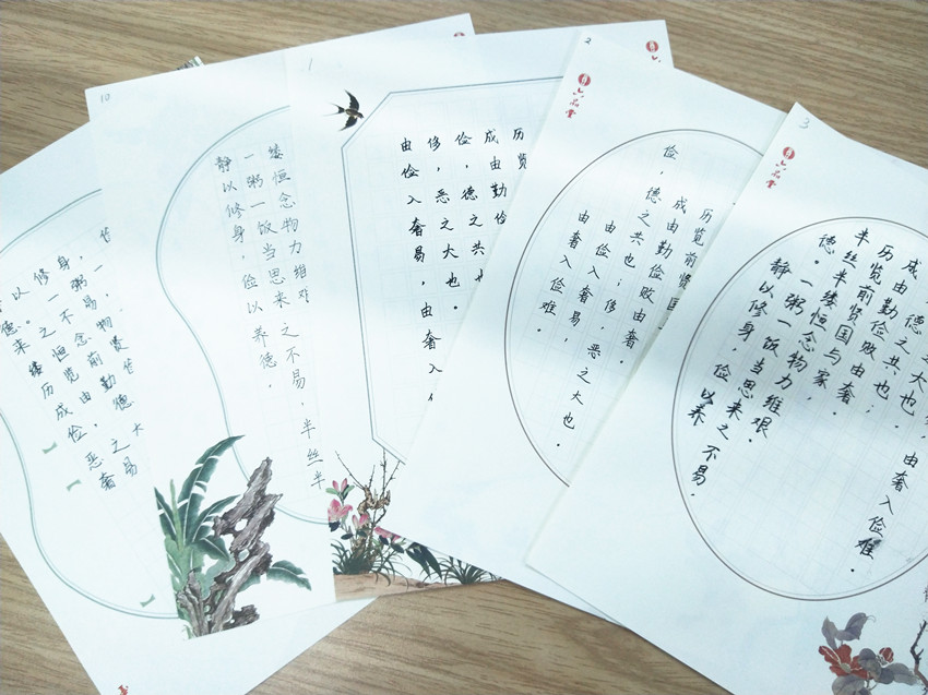 全体教师3:30准时在一(2)班教室集中,先分成欢乐组和青春组分别抽签,后按组别入座。青春组书写的主题是“勤俭节约”,欢乐组的主题则是“师德修养”。活动开始了,每个老师拿着书法纸,对照着事先分发在桌上的书写内容认真书写。他们有的奋笔疾书,有的慢条斯理,每位老师都在通过笔端展示着自己的精气神。“字如其人”,毫不夸张,有的苍劲有力,有的婉转细腻,有的粗细变化明显,有的任情恣意……