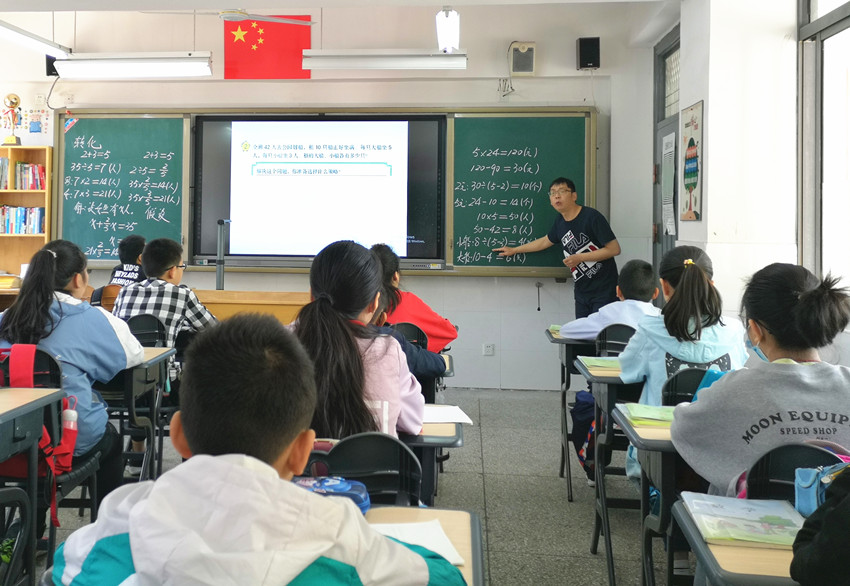 活动第一个环节由赵主任执教苏教版六年级下册《解决问题的策略》整合课。赵主任在教授新知前出示了一组和新知相关的练习,以此了解疫情期间学生在家网课的学习情况。接着,他根据学生的情况,将三课的内容整合在一课进行教学。课堂上以学生为主体,让学生多说,呈现出不同的解决问题的策略。在学生讲解难点时,赵主任及时进行点拨和相应练习的跟进。整节课课堂气氛热烈,学生积极思考,积极寻找多种策略解决问题。最后,赵主任对所有的策略进行回顾总结,引导学生说一说本节课的收获。整节课节奏紧凑,由于老师的巧妙整合和点拨,所以学生学起来并不觉得困难,反而更加的轻松。