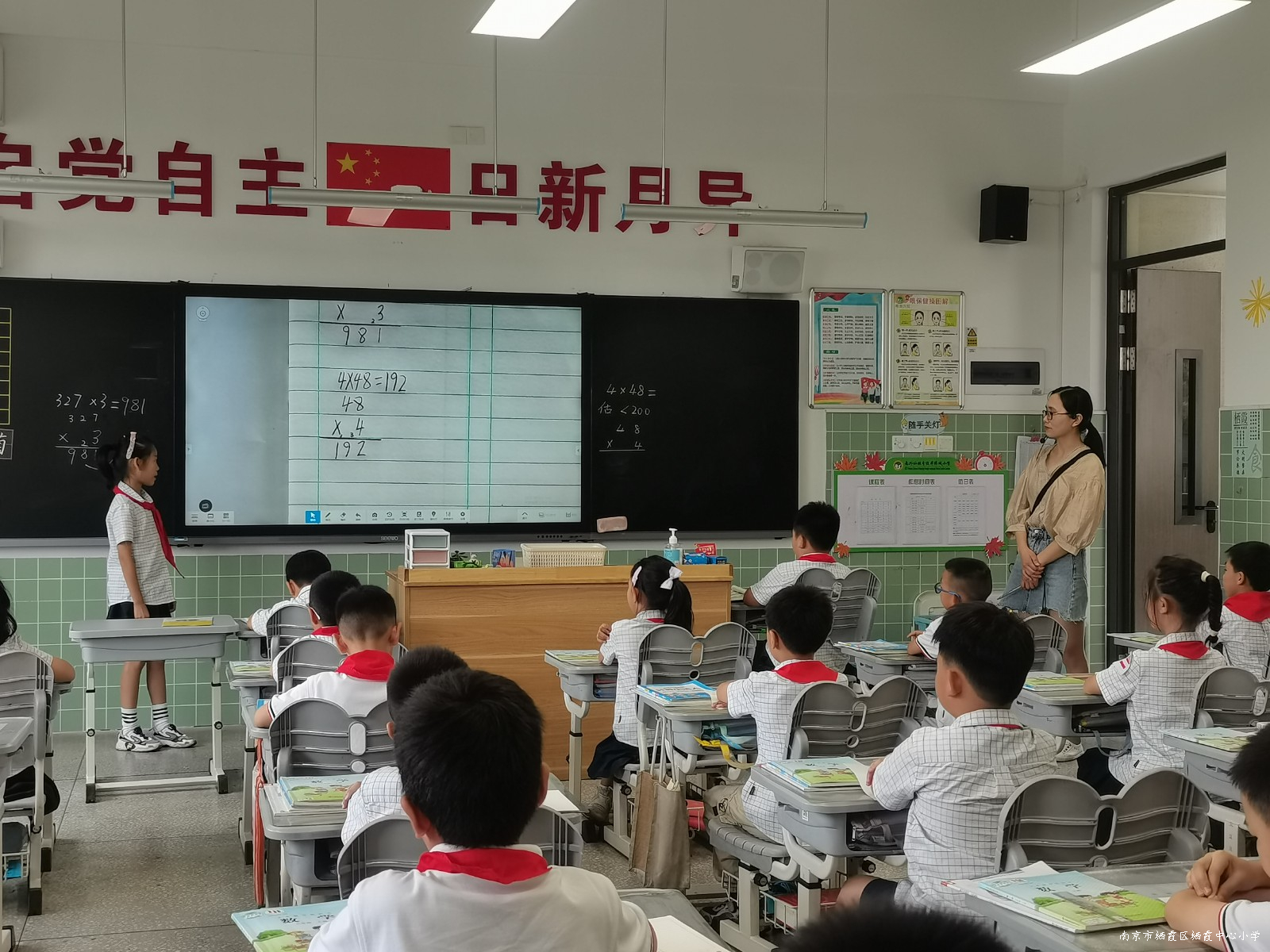 首先由肖连群老师执教一节研讨课《两、三位数乘一位数的笔算(连续进位)》。肖教师课前精心研读教材,关注学生对算理的理解和掌握。教学中,老师先放手让学生独立尝试笔算,再在互动交流中引导学生进行算理表达,在表达中感悟算理、掌握算法。课堂练习层次清晰,形式多样,关注了学生在练习中的易错点。同时,老师还将学生的错误笔算当做课堂生成资源,在找错纠错中深化对算理的理解。肖老师教态沉稳,各个环节板块清晰,衔接自然。学生在课堂上积极发言,思维活跃。