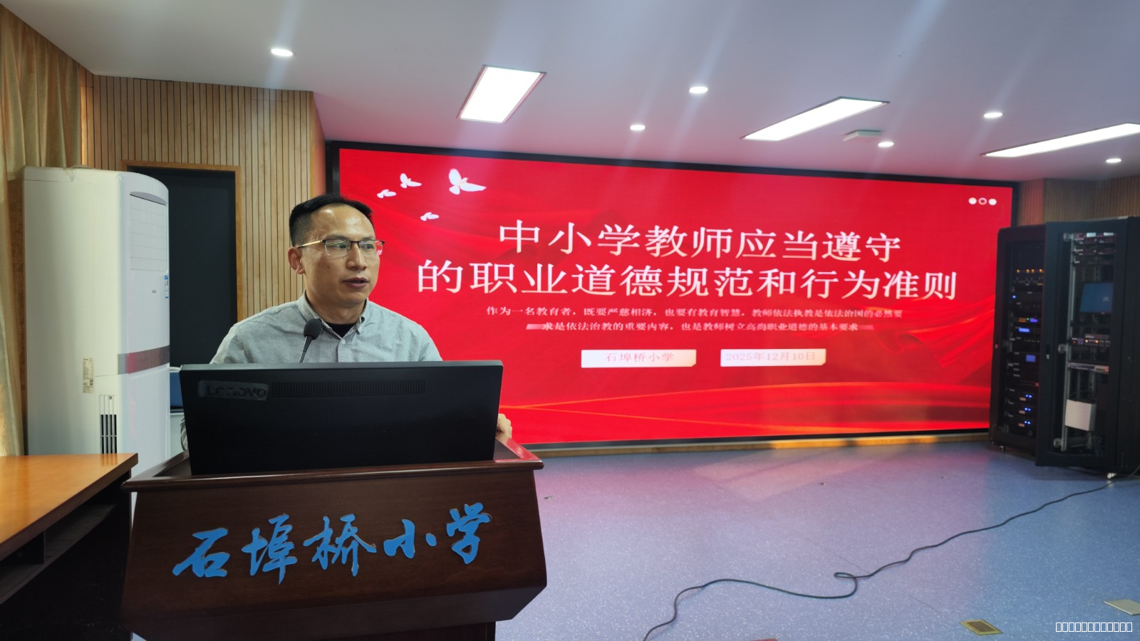 为进一步加强教师队伍建设,弘扬高尚师德师风,增强教师的责任感与使命感,12月10日下午,石埠桥小学开展了师德专题教育活动。全体教师齐聚西阶梯教室,聆听榜样故事,明确职业规范,共同接受了一次深刻的职业精神洗礼。