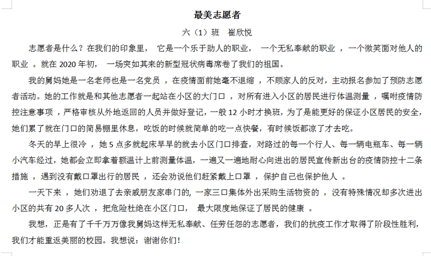 在各班语文老师精心指导下,3-6年级学生积极参加此次征文活动。最终评选出了多篇优秀“抗疫日记”。本次征文活动不仅锻炼了学生的习作能力,而且培养了学生接触社会、关心时事的能力。