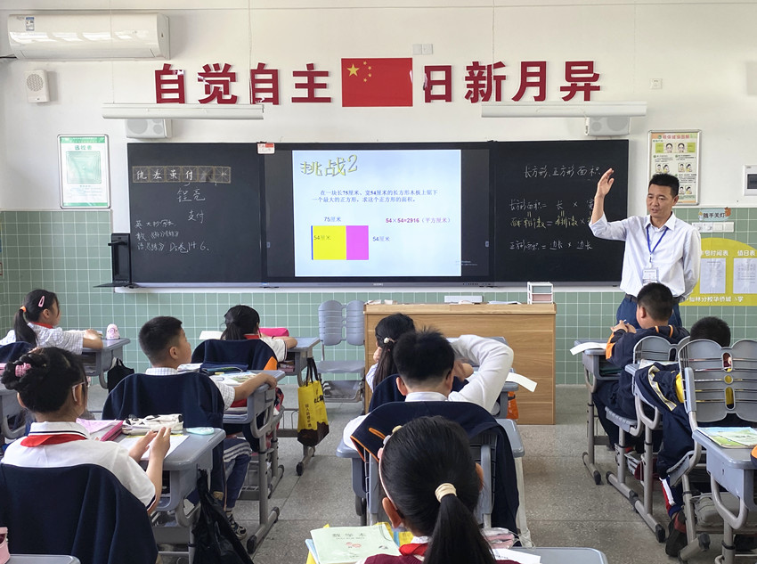 本次活动分为两个环节,首先由王志清老师执教三年级《长方形和正方形面积计算练习》一课。王老师课前进行了精心的教学设计,课堂上通过复习长方形、正方形面积公式的由来,循序渐进地引导学生积极思考。练习环节,通过题组练习引导学生区分图形的周长和面积,同时王老师还选择了生活中实际问题作为拓展,引导学生将生活中的问题逐渐抽象为数学问题,并用画图的方法分析问题、解决问题,让学生充分体会数形结合思想在数学学习中的重要意义。整节课学生积极举手发言,大胆表达自己的想法,研究氛围浓厚。