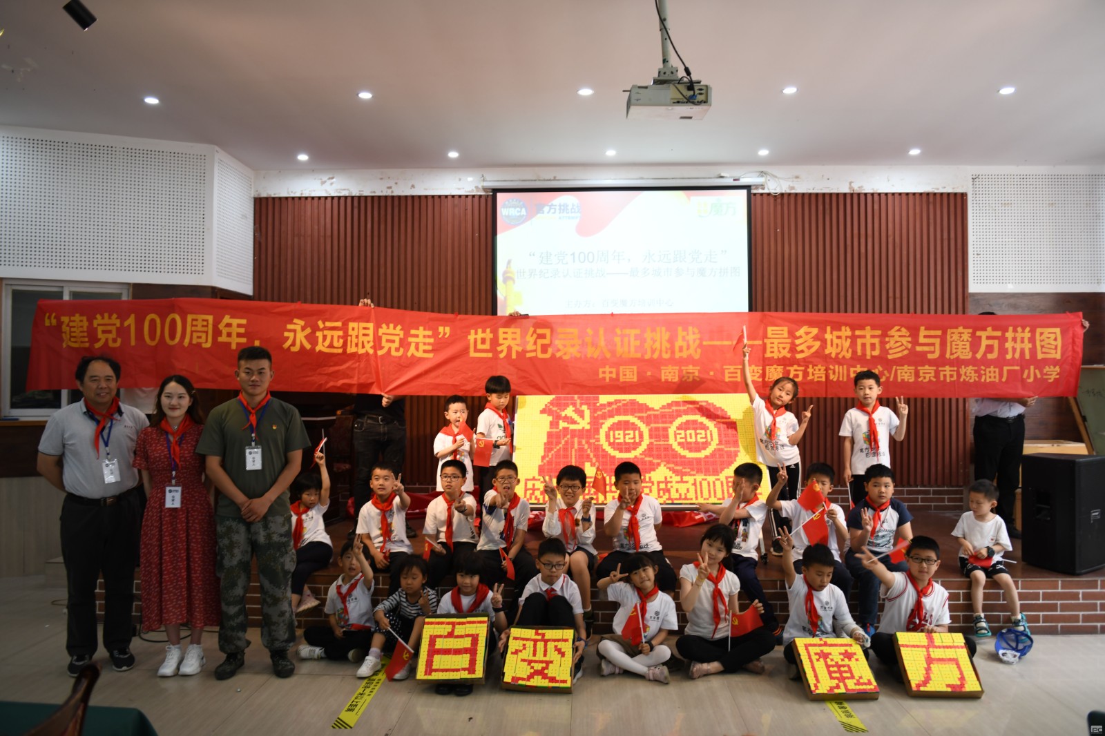 为庆祝中国共产党建党100周年,引导少年儿童永远心向党,5月30日,在南京市关心下一代工作委员会的指导下,炼油厂小学协助百变魔方培训中心举办“‘建党100周年,永远跟党走’世界纪录认证挑战——魔方拼图”活动。本次活动在十月军校举行。20多名魔方爱好者,在同一时间旋转512个魔方,共同拼成中国共产党成立100周年庆祝活动标识。